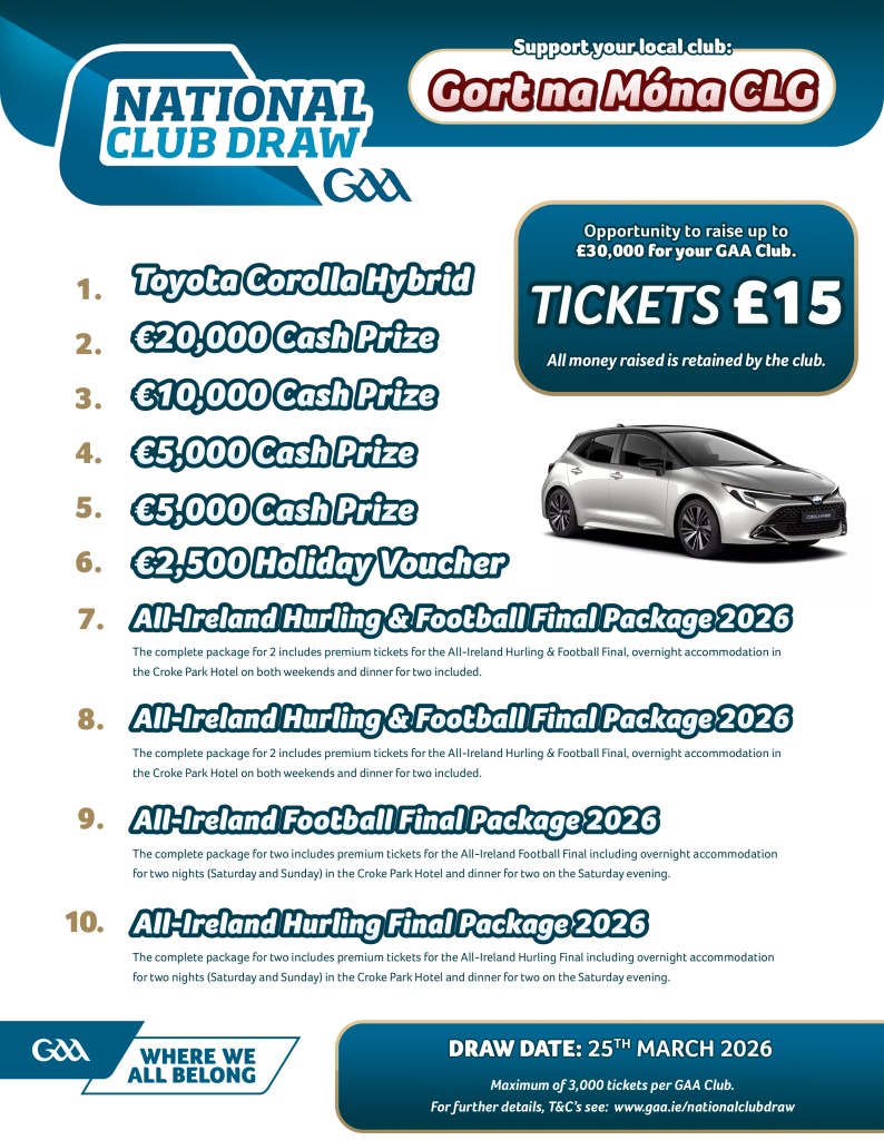 The GAA National Club Draw is now underway. There are some great prizes up for grabs and all money raised goes back into the club to support our teams and our work. You can enter by logging into your Foireann account or tickets will be available at the bar.